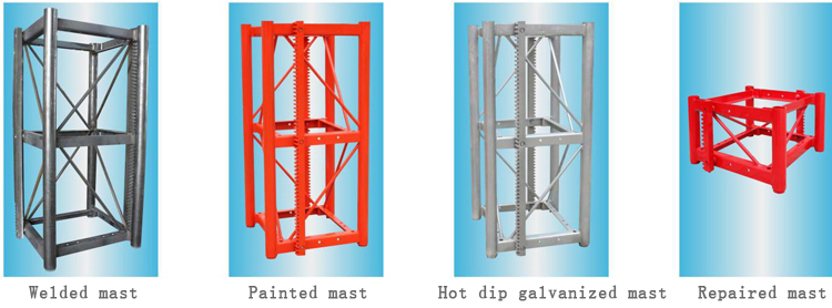 The cage structure is welded with a special tire, which is firm and strong. After the cage is welded, it is also treated with integral heat-diffusing zinc to ensure that the rust-proof performance of the cage is greatly enhanced, and the galvanizing is also painted. It not only guarantees a layer of rust, but also makes the cage more beautiful. Standard section options: standard section specification 650X650X1508, thickness 4.5/6.3/8/10 customers can choose standard sections of different thickness according to the height of the building. According to the user's needs, the standard section surface can be painted or hot dip galvanized (with relatively high strength and corrosion resistance). The rack is painted.
